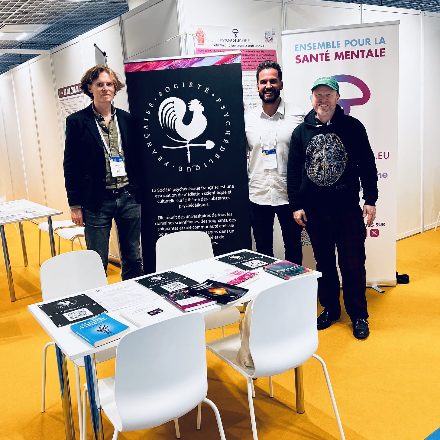 La lumière, nous l’avons vue assez tôt, afin de pouvoir installer le stand de la Société psychédélique française dès la veille au soir, judicieusement positionné entre ceux de Fédération Addiction et de l’OFPN. Dans les bagages et bientôt montés, un roll up de la SPF, un autre de PsychedeliCare (ainsi qu’un poster résumant le positionnement de l’initiative), des stickers, quelques exemplaires du manuel de réduction des risques et des ouvrages français traitant du champ des psychédéliques : Dominique Nora, Stéphanie Chayet, Christophe Tison, Mathilde Ramadier, Joël Bockaert, Christian Sueur…